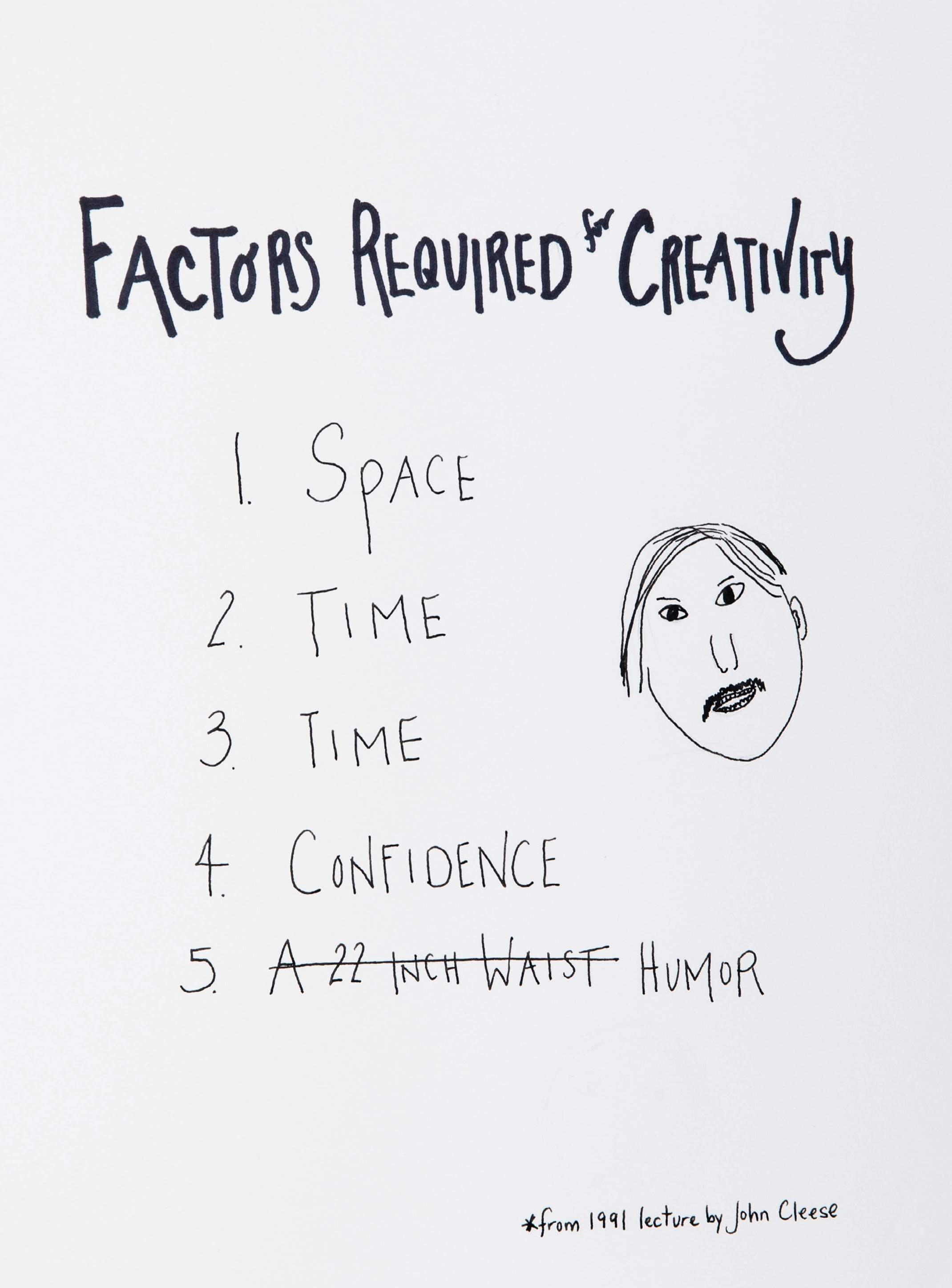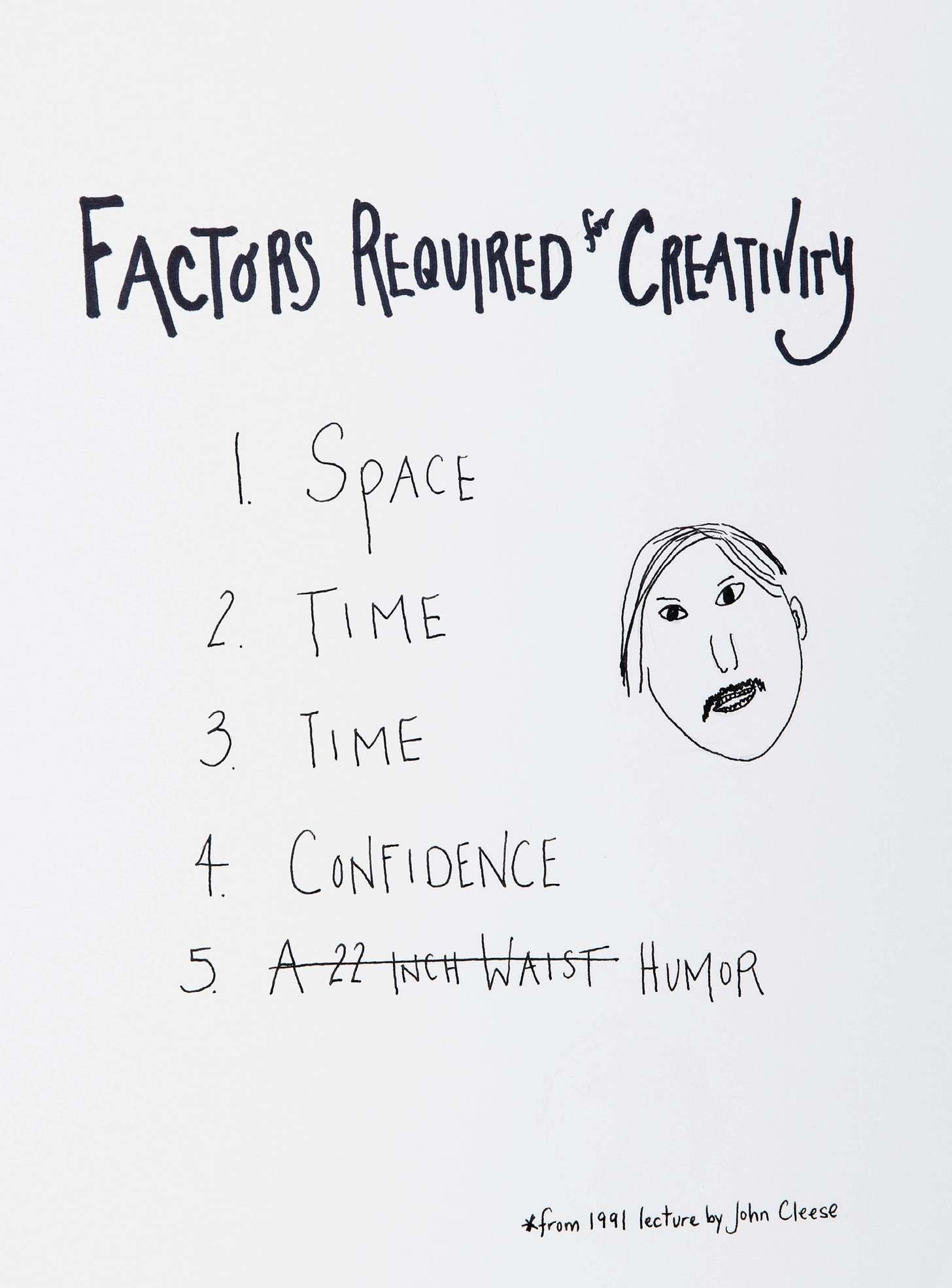 There’s a lecture about creativity by John Cleese that Jenny mentions in her book. In it he talks about 5 Factors for Creativity. What struck me immediately about this list is that he doesn't say anything about childcare. I can't think of creating anything without thinking about who is going to watch my kids if it's not me. I was only able to work on my project because my partner was willing to do a lot of the childcare.