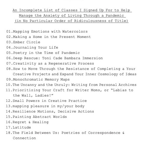 Take a class. Here’s a somewhat embarrassing list of all the random classes I took over the years I worked on my project. Most of these were one-offs, a couple of hours, pretty cheap. A lot of times taking the class was my creative work, and that was enough.