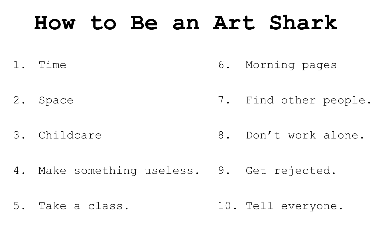 I think the work of being an art shark is a collective rather than an individual effort. And our collective work is to try to make time and space for creative practice available for each other and for as many people as possible.