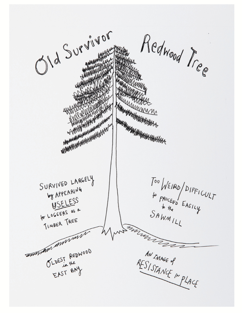 Make something useless. Make something just for yourself. It’s okay to be illegible. There is value in uselesslessness. Jenny writes about Old Survivor, a redwood tree that has survived for years by appearing useless to loggers as a timber tree.